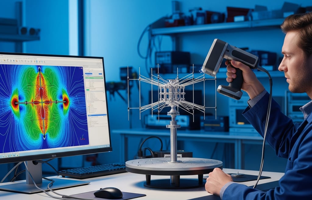 O primeiro passo é a engenharia reversa com scanner 3D, que permite capturar a geometria física da antena com total fidelidade. A partir desse modelo digital, importamos os dados para softwares especializados e aplicamos métodos numéricos avançados, como o Método dos Elementos Finitos (FEM) e o Método dos Momentos (MoM).